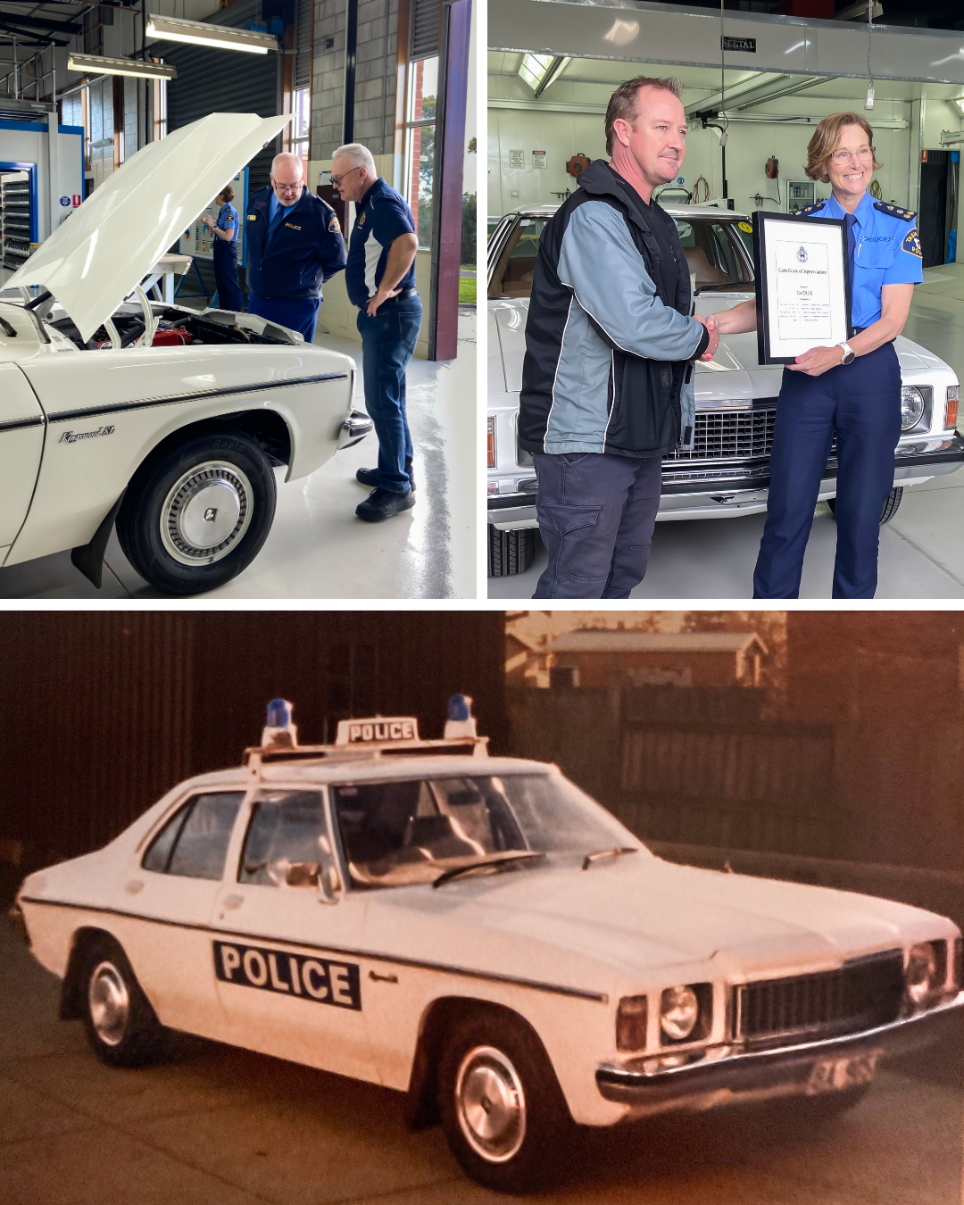 L–R: Inspector Grant Twining; Commander Jo Stolp; and TasTAFE’s Mark Campbell, with the restored a 1978 HZ Holden Kingswood sedan.